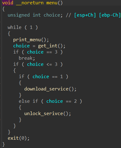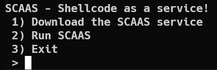 程序主要功能类似于一个菜单,第一个选项会调用我们之前用来下载附件的函数;第二个选项调用 unlock_serivce ,函数内若判断都满足则会调用 scaas 函数,而 scaas 函数里可以执行我们输入的 shellcode 。所以目标就是绕过前面的判断进入到 scaas 函数里执行 shellcode