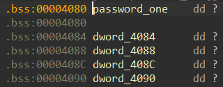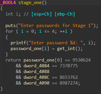 允许输入5次,分别赋值到 password_one 数组0~4下标的位置,也就分别是 password_onedword_4084dword_4088dword_408Cdword_4090 的位置(后面两个用于判断的函数也一样。所以只需要按返回时的那几个判断分别给这几个变量赋值相应的数字即可