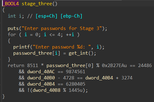 这里用z3解的话解出的结果是不能通过判断的(个人猜测是因为 8511 * password_three[0] 在求解过程中的值太大造成了 unsigned int 的整数溢出导致结果不正确)